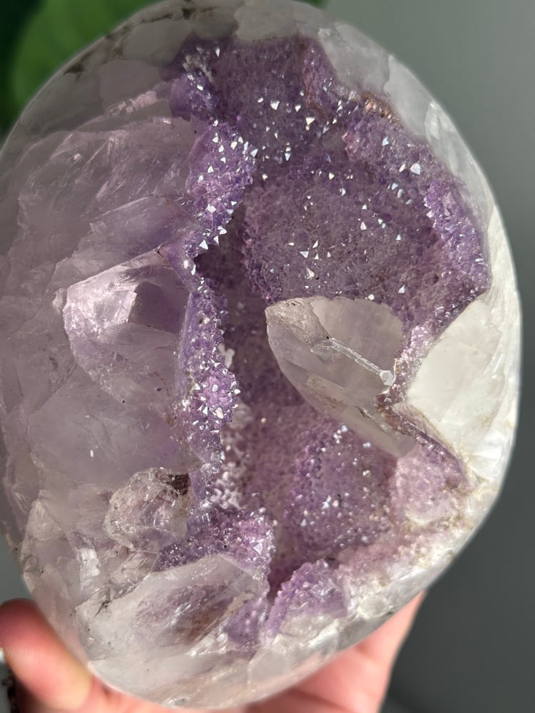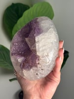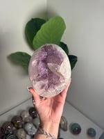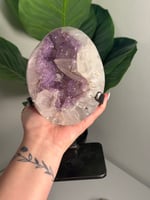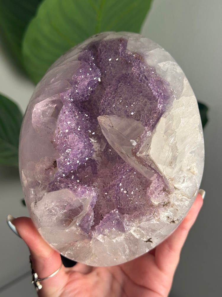 LAVENDER DRUZY QUARTZ EGG WITH RAINBOW FILLED CALCITE POINT ON A STAND -URUGUAY-