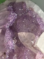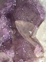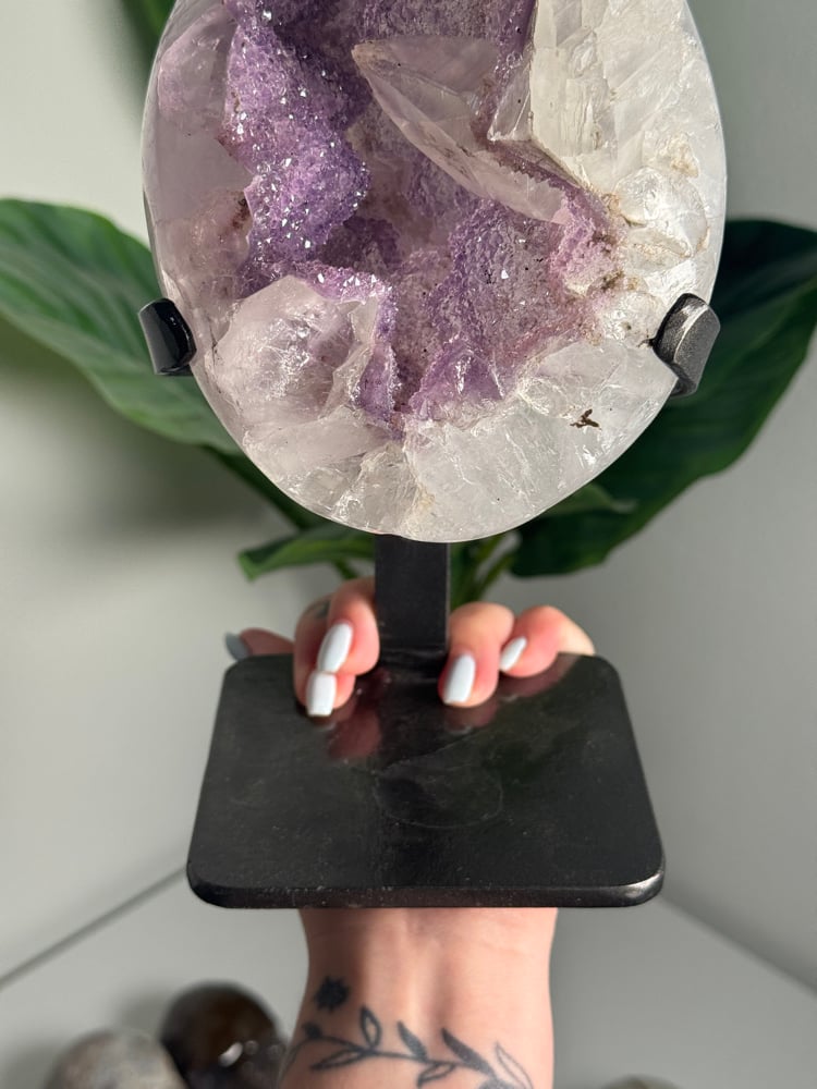 AMETHYST ON A CUSTOM STAND WITH A PERFECT SUGAR COATED CALCITE POINT -URUGUAY-